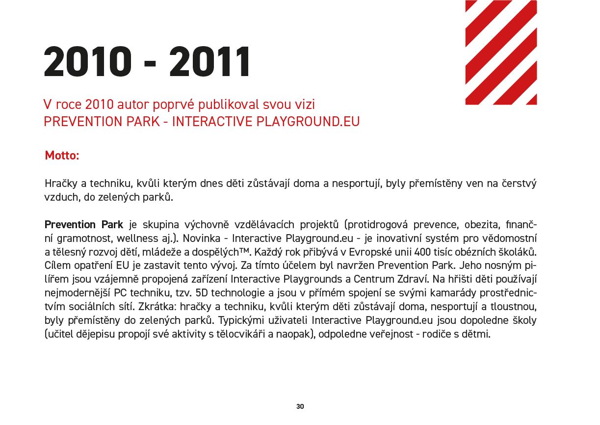 Prevention Park je skupina výchovně vzdělávacích projektů (protidrogová prevence, obezita, finanční gramotnost, wellness aj.). Novinka - Interactive Playground.eu - je inovativní systém pro vědomostní a tělesný rozvoj dětí, mládeže a dospělých™. Každý rok přibývá v Evropské unii 400 tisíc obézních školáků.