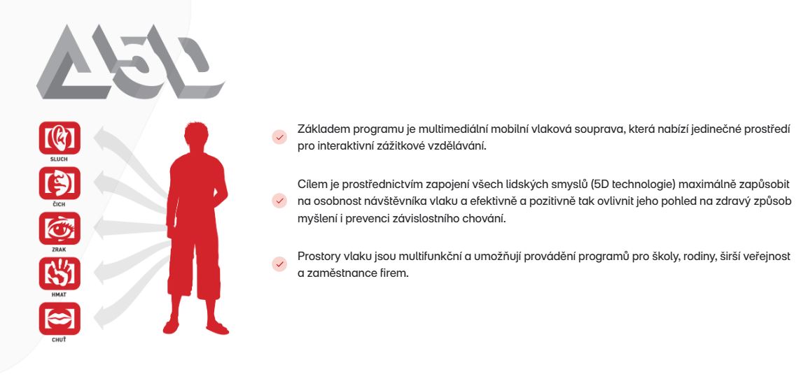 Multimediální vlaková souprava rozšiřuje formou zážitkové pedagogiky dosavadní přístupy k primární prevenci. V kinosálech návštěvníci sledují v několika rovinách reálný příběh o příčinách, vývoji a důsledcích závislostí. Zdvihnutím projekčního plátna se návštěvníkům propojuje virtuální a reálné prostředí (bar, autonehoda, drogové doupě, výslechová místnost). Díky interaktivním technologiím se ve stominutovém příběhu děti a mládež stávají jeho aktivními účastníky. Příběhem natočeným podle skutečné události provádí lektor, který se skupinou diskutuje o jednotlivých tématech. V rámci 5D programu probíhá simulace rozhodování účastníků v kritických životních situacích (např. řízení vozidla pod vlivem návykových látek).